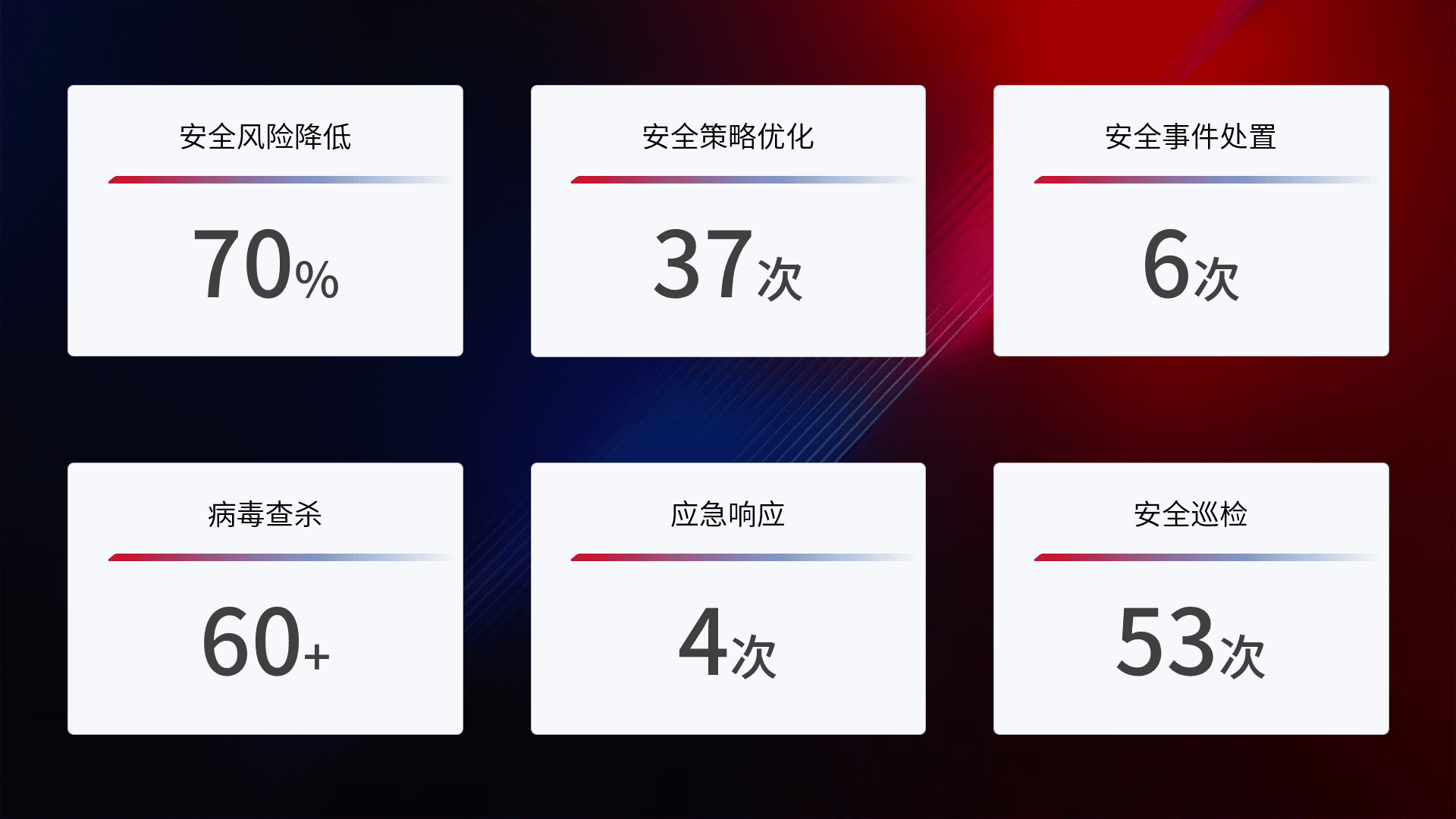 提供全面的安全事件报告体系,,,包括处置报告、、、、周报、、季度和年度总结,,结合持续监控,,,,帮助客户深入了解网络安全状况。。