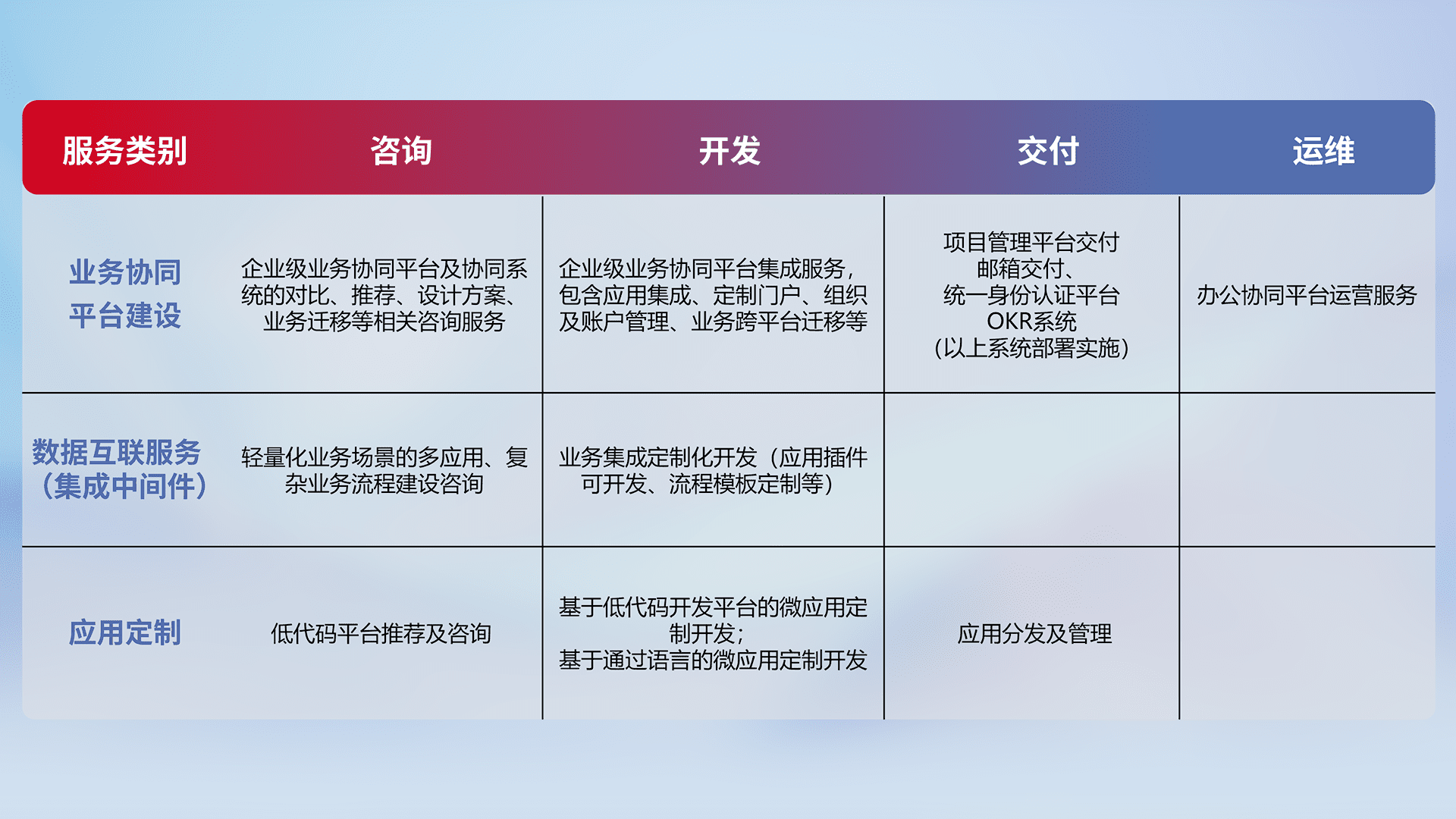 针对钉钉、、企微、、、IDaas等平台级产品提供产品的规划、、、方案、、、交付、、、、定制化开发等服务,,,,实现如统一协同办公、、、智能客户服务、、、混合会议管理、、、智能数据查询、、、等业务场景,,,,实现数字化转型。。。。